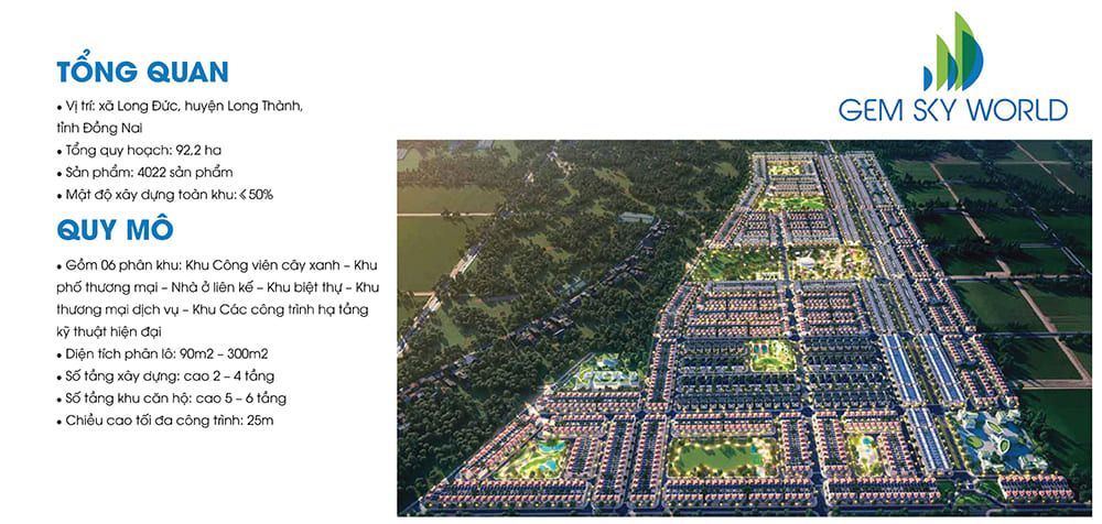 Khu đô thị Gem Sky World là siêu dự án có quy mô 92ha tại xã Long Đức, huyện Long Thành, tỉnh Đồng Nai. Đây là khu đất mà Công ty CTCP Đầu tư Kinh doanh Bất động sản Hà An đã trúng đấu giá với số tiền trên 3.000 tỷ đồng vào hồi cuối tháng 08/2019. Hiện tại đến tháng 08/2022 dự án đang dần hình thành hạ tầng và triển khai bán hàng.