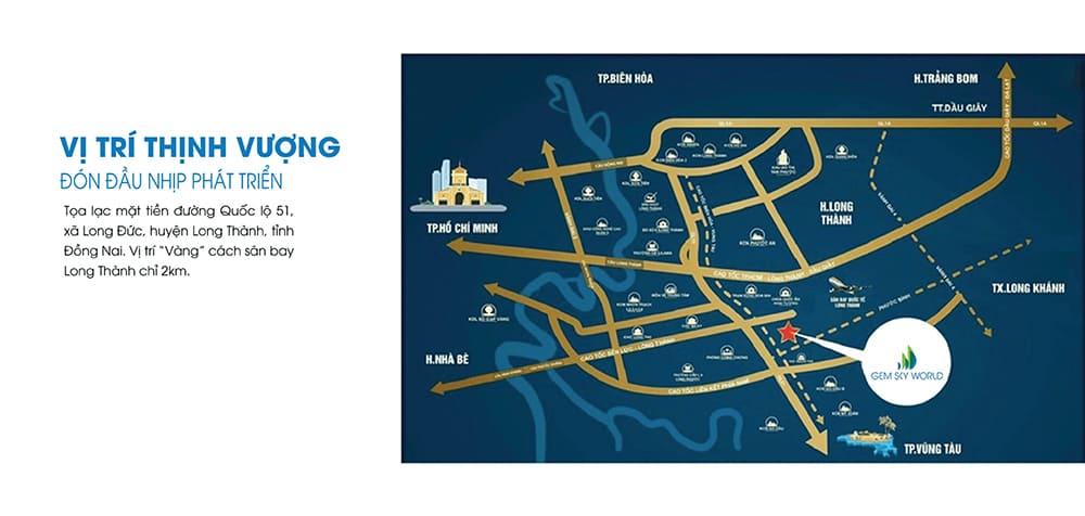 Dự án Gem Sky World toạ lạc trên trục Quốc lộ 51, xã Long Đức, huyện Long Thành, tỉnh Đồng Nai. Gem Sky World chỉ cách cao tốc Sài Gòn – Long Thành chỉ 1km và cách Sân bay Long Thành 2km.