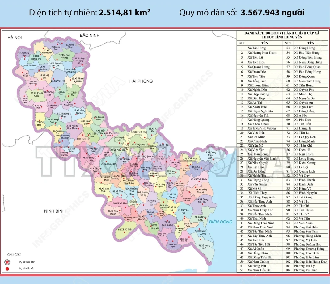 Bản đồ hành chính tỉnh Hưng Yên sau sáp nhập có diện tích 2514,81km2 với 104 đơn vị hành chính cấp xã, gồm 93 xã và 11 phường.