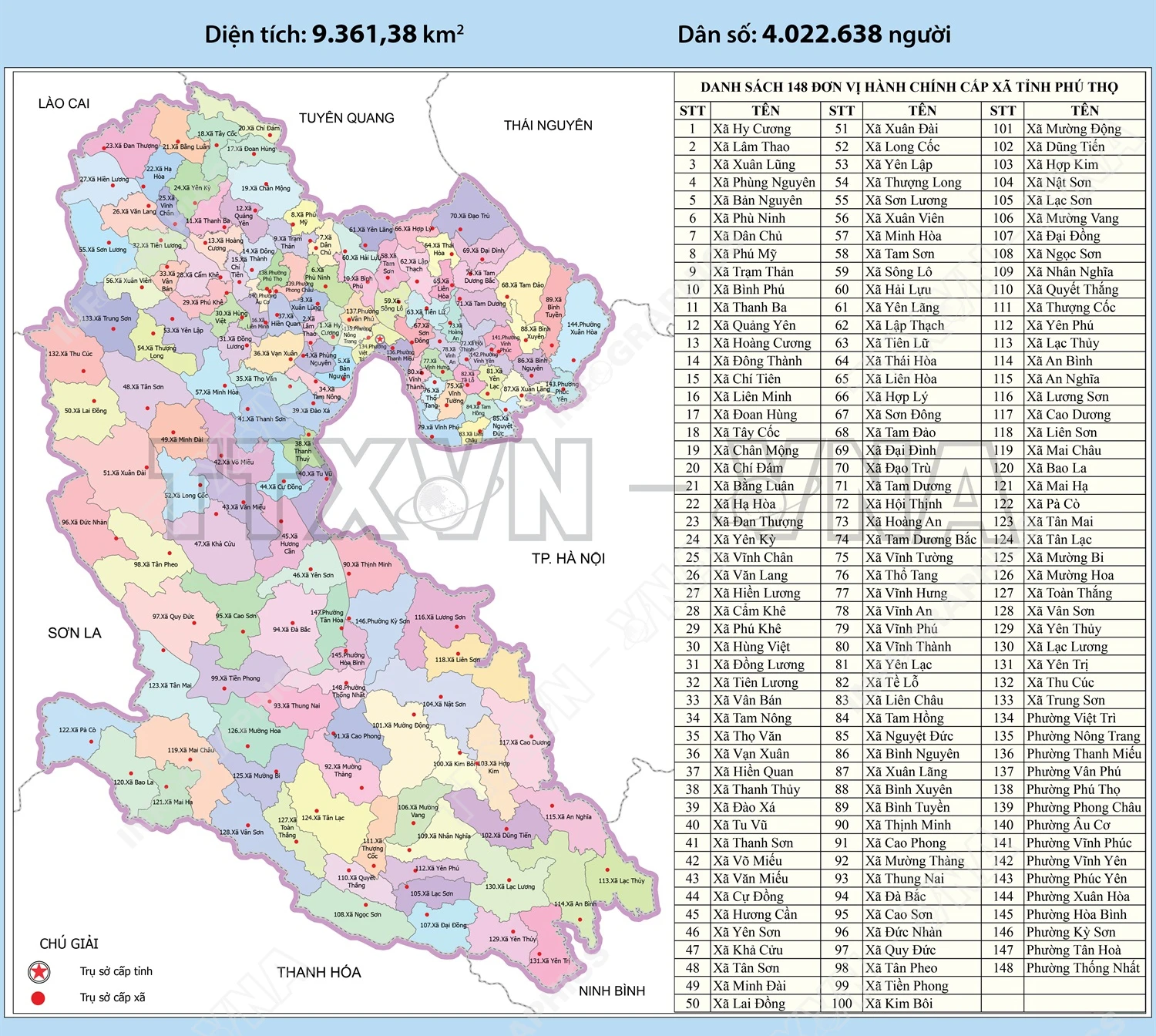 Bản đồ hành chính tỉnh Phú Thọ mới có 148 xã, phường, với xã Xuân Đài rộng nhất (hơn 209 km2) và phường Âu Cơ nhỏ nhất (12,51 km2).