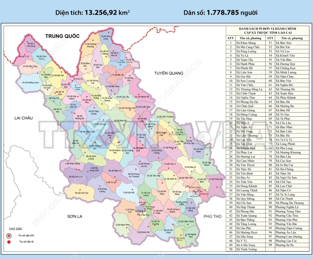Bản đồ hành chính tỉnh Lào Cai sau sắp xếp có 99 đơn vị hành chính cấp xã, gồm 89 xã và 10 phường. Trong đó có 81 xã, 10 phường hình thành sau sắp xếp và 8 xã không thực hiện sắp xếp là các xã Nậm Xé, Ngũ Chỉ Sơn, Chế Tạo, Lao Chải, Nậm Có, Tà Xi Láng, Cát Thịnh, Phong Dụ Thượng.