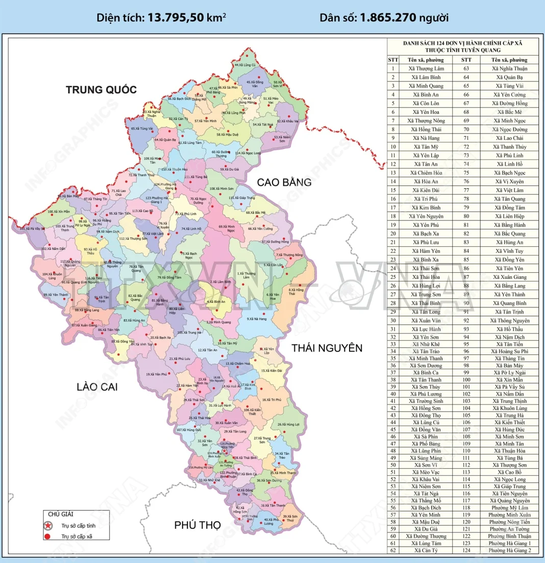 Bản đồ hành chính tỉnh Tuyên Quang sau sáp nhập có diện tích 13.795,50km2 với 124 đơn vị hành chính cấp xã, gồm 117 xã và 07 phường.