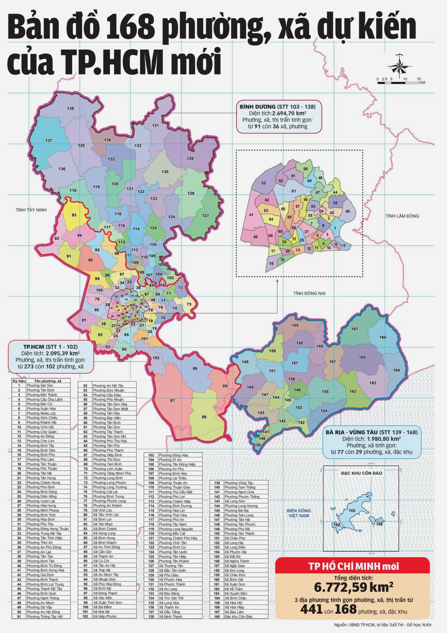 Thành phố mới có tổng diện tích hơn 6.700 km², với quy mô dân số gần 14 triệu người. Cơ cấu hành chính cấp xã của TP.HCM sau sáp nhập bao gồm 168 đơn vị, trong đó có 113 phường, 54 xã và đặc khu hành chính Côn Đảo.