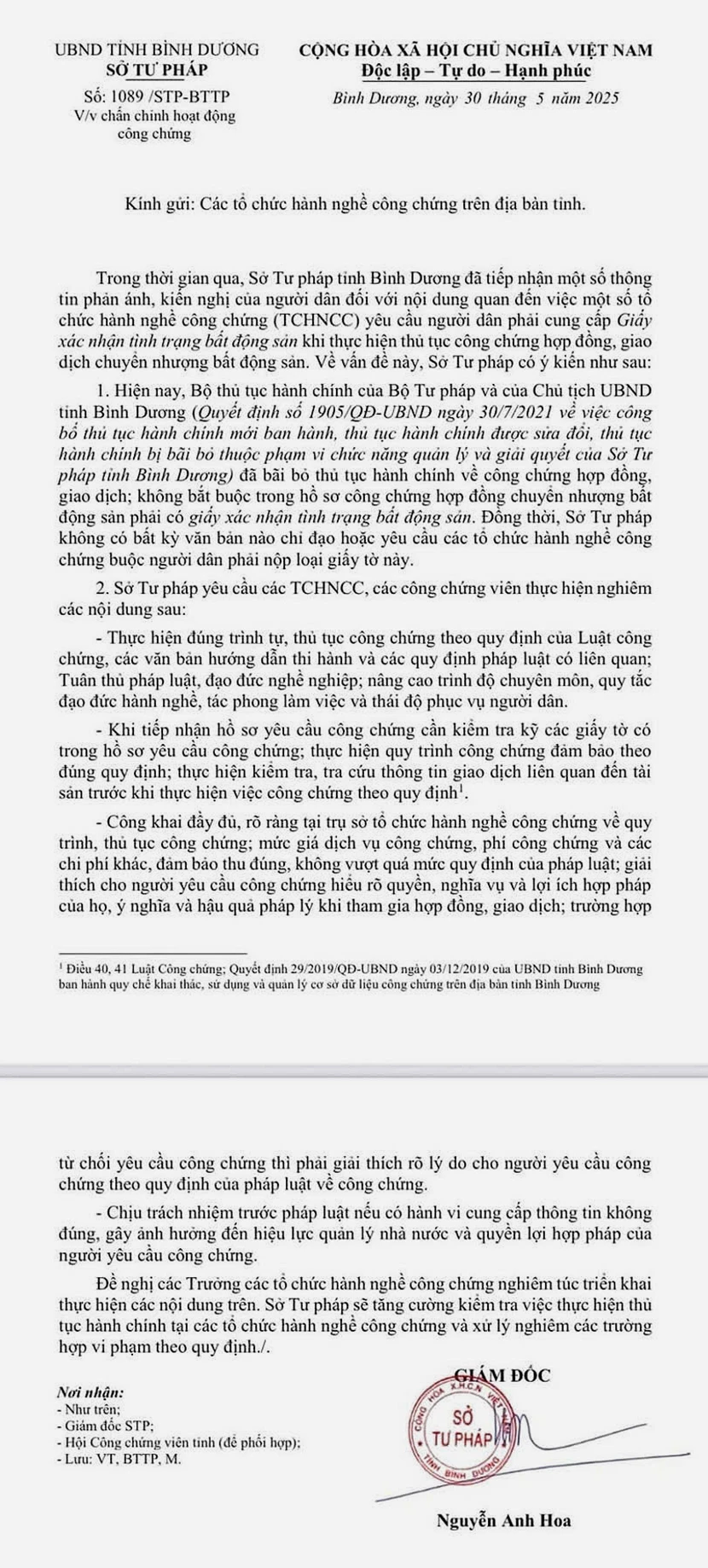 Vào ngày 30/5/2025, Sở Tư pháp tỉnh Bình Dương đã ban hành văn bản số 1089/STP-BTTP, chấn chỉnh hoạt động công chứng liên quan đến việc yêu cầu Giấy xác nhận tình trạng bất động sản trong thủ tục công chứng hợp đồng, giao dịch chuyển nhượng nhà đất.