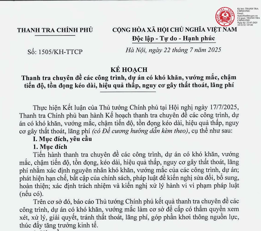 Theo Kế hoạch số 1505/KH-TTCP của Thanh tra Chính phủ, trong năm 2025, Việt Nam sẽ triển khai một đợt thanh tra chuyên đề quy mô lớn nhằm kiểm tra, đánh giá các công trình, dự án có dấu hiệu khó khăn, vướng mắc, hoặc tiềm ẩn sai phạm. Các dự án được đưa vào danh sách thanh tra do Bộ Tài chính cung cấp, tập trung vào những công trình có quy mô lớn, quá trình đầu tư xây dựng kéo dài, phức tạp, hoặc có khả năng xảy ra sai phạm nghiêm trọng.